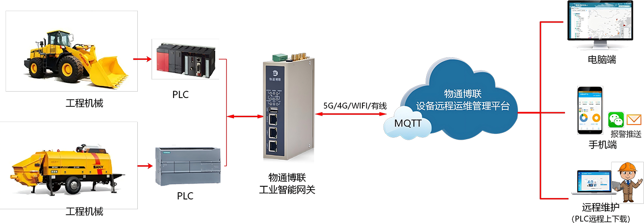 顺利获得yth游艇会yth206的工业智能网关,连接工程机械设备的控制器、传感器等设备,实时采集设备的位置信息、运行状态(如工作、空闲、故障等)、运行参数(如发动机转速、油压、水温等)、油耗等数据。将采集到的数据传输至设备运维管理平台,平台对数据进行分析和处理。当设备出现故障时,及时发出预警,并顺利获得yth游艇会yth206设备维护快线进行远程维护,提高维护效率,降低运维成本,实现设备全生命周期数字化管理。