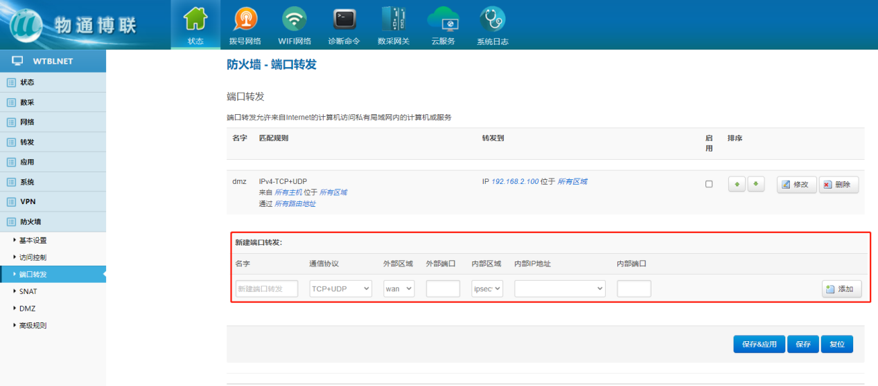 下载中心 视频中心 常见问题 售后服务 工业网关 设备快线 数据云平台 联网设备 问答百科 工业网关如何配置端口映射? 时间:2022-10-26 09:39:53 点击:8045 关键词:工业网关,网关配置,端口转发 问题:工业网关如何配置端口映射? 回答: 网关配置界面—防火墙—端口转发 端口转发允许来自Internet的计算机访问私有局域网内的计算机或服务 使用场景:端口转发是将发往外网的一个端口的通信完全转发给内网一个地址的指定端口 上一篇:如何顺利获得yth游艇会yth206工业网关实现网口设备远程上下载? 下一篇: 工业智能网关支持的电压范围?
