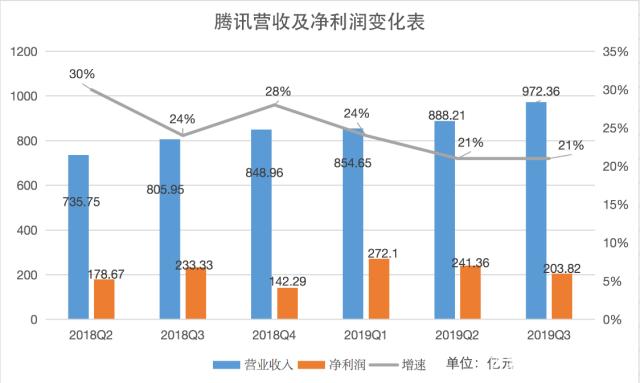 腾讯财报显示,2019年第三季度营收972亿元,同比增长20.6%,低于市场预期的990.4亿元,增速与上季度持平;第三季度,公司股东应占利润,即净利润203亿元,同比下降13%,低于市场预期的235.3亿元。