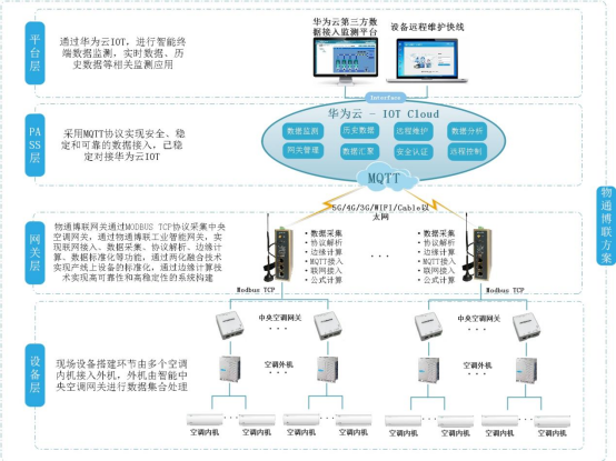顺利获得 RS485、RS232、以太网等多种接口,yth游艇会yth206工业智能网关能连接新风设备控制器 PLC、温湿度传感器、空气质量传感器、风量风压传感器等设备,实时采集设备运行状态、环境参数等数据。随后利用 5G、4G、WIFI、以太网等通信方式,将采集的数据安全、稳定、高速传输至智慧楼宇管理系统中,为用户给予可视化界面,实现设备远程监控、数据分析、故障告警、远程控制等功能。