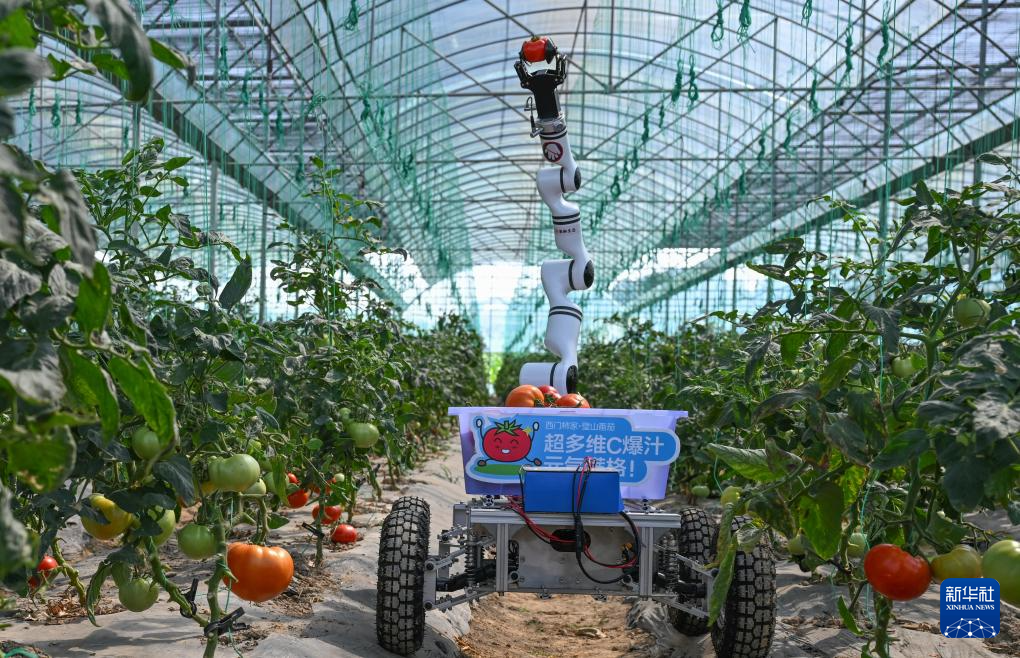 6月12日,重庆璧山番茄小镇·果琳基地内,机器人自动摘取成熟的番茄。新华社记者 陈诚 摄