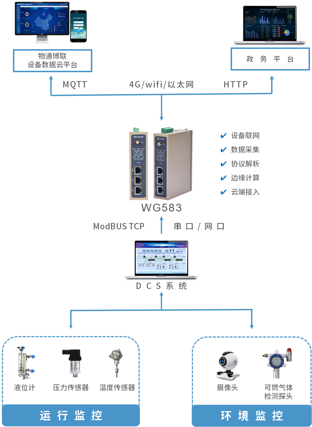 某化工罐区站点面积较大,巡检工作量很大,现要求实时远程监控每一个储罐的温度与液位,并对整个罐区的阀门、电机进行集中控制,以实现快速调配与故障感知,减少人力投入的同时提高工作效率,确保现场安全。