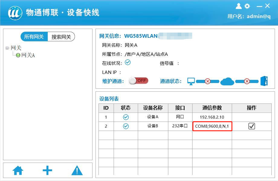 1、启动 “设备快线客户端软件”软件,顺利获得官方给予的账号密码登录。选择在线网关,不用打开维护通道,勾选设备列表的设备等待弹出串口透传通道建立成功,点击确认,远程维护完毕后需关闭通道。