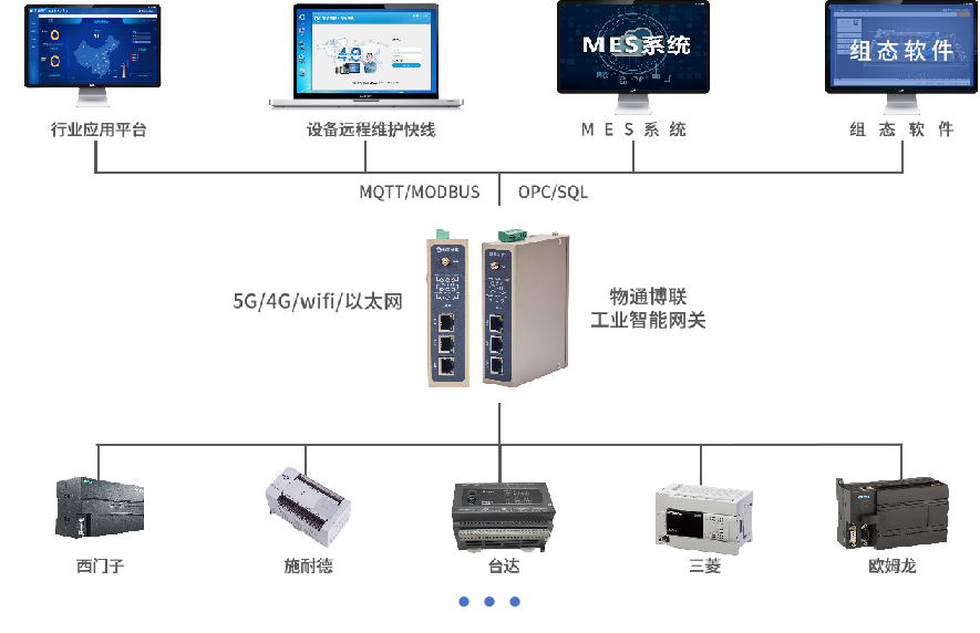 支持5G\4G\WIFI\以太网等方式,实现设备联网、设备远程通讯,满足各种不同的工业应用场景