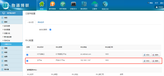 错误诊断 若采集的数据值为“NULL”,请排查接线是否正常,核对数采配置中设备通讯参数与变量参数信息是否正确。 若采集的数据值不正确,请核对变量类型及对应类型地址范围是否正确。 3 云服务配置 中心类型 (1)IOT数据云平台:为我司公网地址,数据可上传至我司IOT平台进行数据监控以及远程维护、远程部署配置。