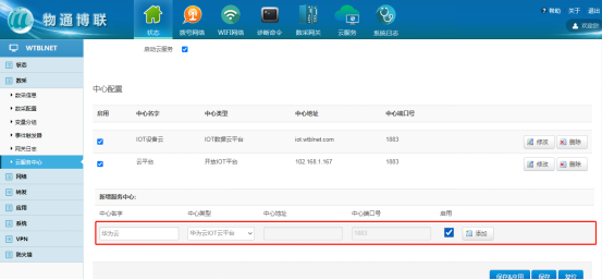 (4)第三方平台设备接入:例如阿里云、华为云、百度云等第三方设备接入平台,网关已开发好适配此类第三方平台的物模型接入,例如华为云,填写相关连接参数,配置内容,即可将数据上传至华为云IOT设备接入模型中(网关支持的第三方接入云,都有详细的配置手册)。 选择第三方设备接入平台类型,勾选启用,点击添加;