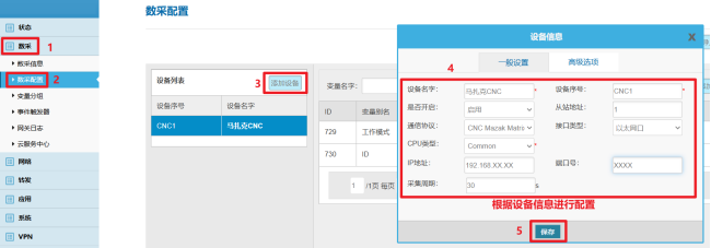 3 网关数采配置 1.设备配置 根据CNC设备情况及信息配置后保存。