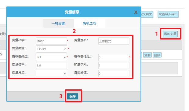 注意:数采网关LAN口地址必须与CNC IP处于同一网段且不冲突,保证网关可以Telent通CNC (IP与端口)。如果Telent不通,可查看本手册第28页“3.网关与CNC同网段配置”。 2.变量配置 变量配置主要是定义变量名(自定义内容,不可使用中文命名)、变量别名(自定义,可使用中文名字)、寄存器类型和寄存器偏移地址,并定义一些数据规则(如:倍率、小数点、单位、告警)。