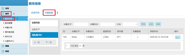 数采配置(设备信息+变量参数)完成后,重启采集程序并生效配置即可在:数采信息---变量数据---设备名称 中看到采集上来的数据。
