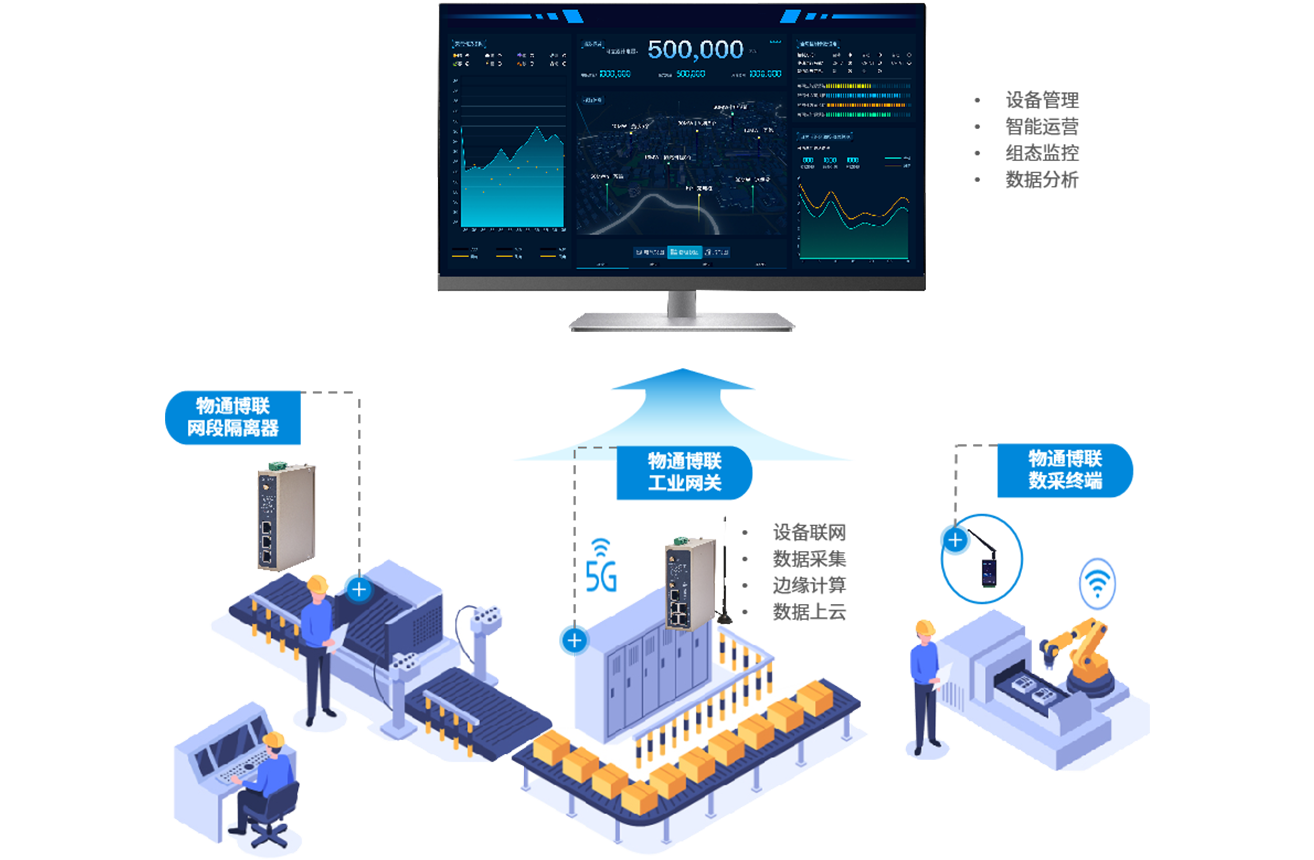 借助yth游艇会yth206的工业智能网关,实时采集工厂各类设备的运行数据,如运行状态、温度、压力、转速等,将采集到的数据传输至设备管理平台,进行设备资产档案管理、运行管理、工单管理、采购管理、备件管理、维修管理、数据分析等,实现设备全生命周期管理。
