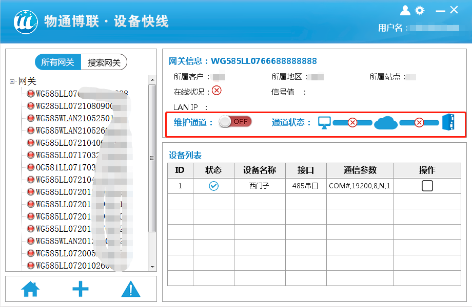 3、设备快线配置 登录设备快线,选择一台需要维护的在线网关,点击建立通道。等到通道状态都是绿色打钩后就证明通道建立完成,以太网设备可以顺利获得ping来测试通道情况。