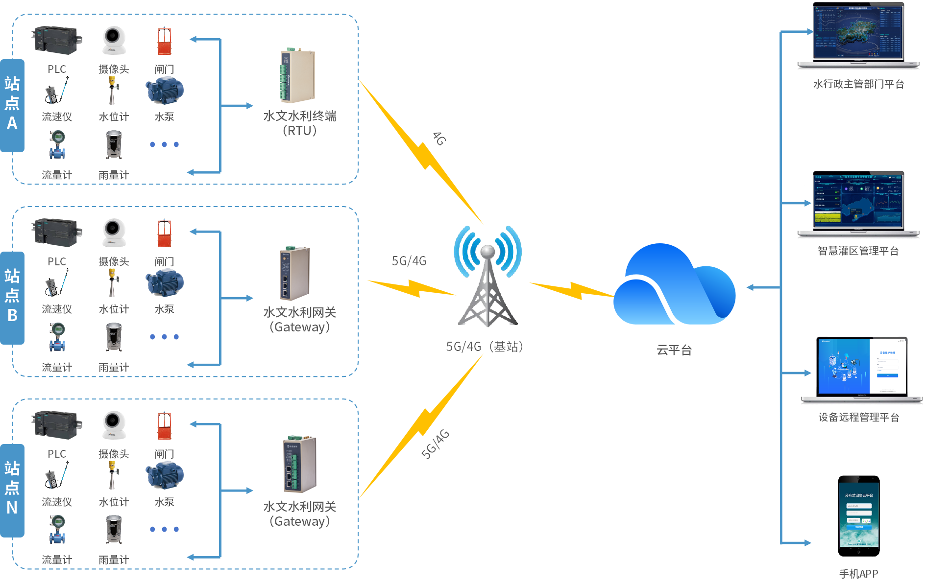 灌区内一体化闸门、水位计、流量计等设备接入yth游艇会yth206水文水利网关(RTU),并顺利获得5G/4G上传到水行政主管部门平台或其他管理平台中,实现可视化展示并在监测到异常数据时自动告警,从而实现对灌区的渠道水位、流量、水雨情等精确管理。此外,顺利获得告警信息与实时数据,管理人员能够适时调整灌溉取水策略,远程控制闸泵开关,远程查看监控视频,有效提升工作效率与响应水平,保障农业生产正常用水。