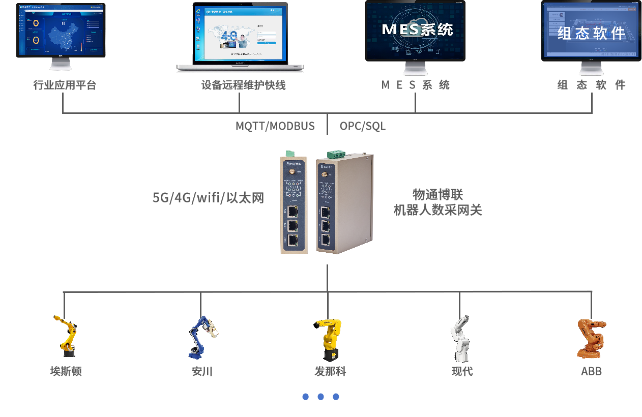 支持将各种机器人的协议转换成Modbus TCP、Modbus RTU、OPC UA、MQTT等协议,实现不同机器人与各种工控软件和控制器之间的互通互联。