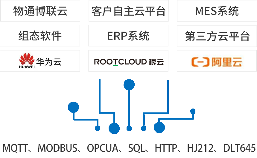 北向支持接入yth游艇会yth206云平台,客户自主开发的云平台,第三方云平台(根云、美云、华为、阿里、百度、微软等IOT云平台),组态软件、MES系统、行业监控平台等工业软件
