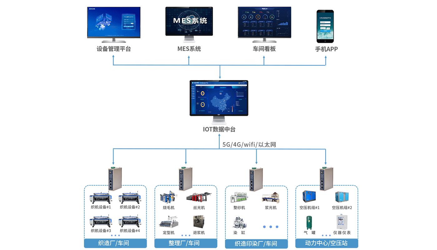 yth游艇会yth206推出了基于PLC物联网技术的纺织工厂设备监控运维系统解决方案。该系统顺利获得工业智能网关与纺织机械的控制器PLC相连接,进行数据采集并以5G/4G、wifi、以太网等方式与yth游艇会yth206设备运维管理平台实时通信,为设备管理、运维管理等方面给予高效便捷的管理手段。 网关也能将数据转发到MES系统,结合数据大屏分析各种设备状态与生产参数,从而帮助制定科学合理的经营策略,助力纺织工厂的数字化转型。