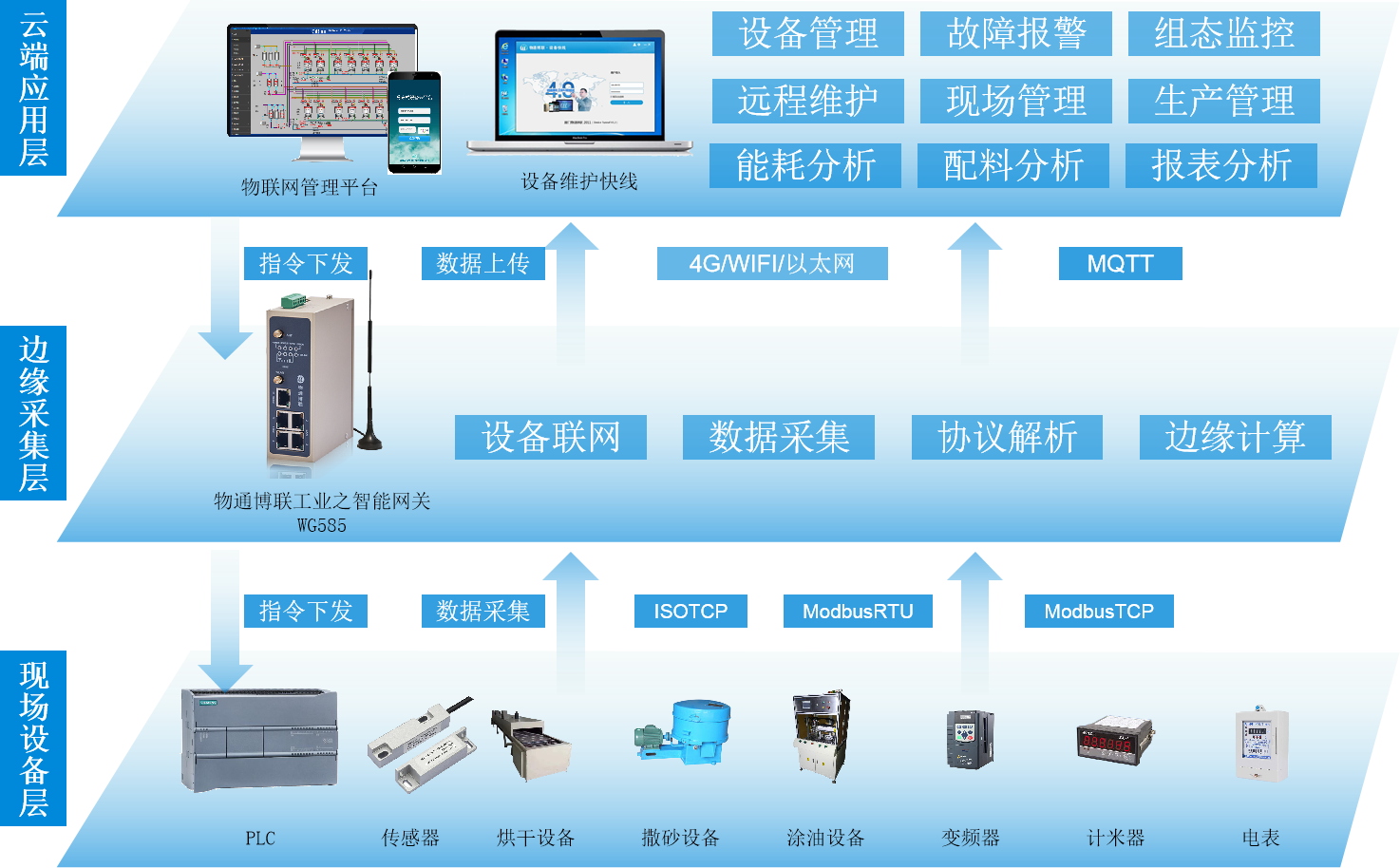 工厂现场具有PLC、温度传感器、压力传感器、烘干机、涂油机、撒沙设备、电表、计米器等设备,顺利获得串口、网口等设备接口将现场设备连接到yth游艇会yth206工业智能网关WG585,网关采集现场设备数据后顺利获得4G/WIFI/以太网等网络方式将数据顺利获得MQTT协议实时上传到物联网管理平台进行分析、处理,管理者顺利获得电脑和手机就能远程查看现场设备运行参数、设备状态、工艺组态、生产情况、物料消耗以及故障记录等,实现设备管理、现场管理、生产管理、远程维护、能耗分析、配料分析、数据分析应用等功能,实现产品生命周期和备品备件管理,保障高效率的生产。