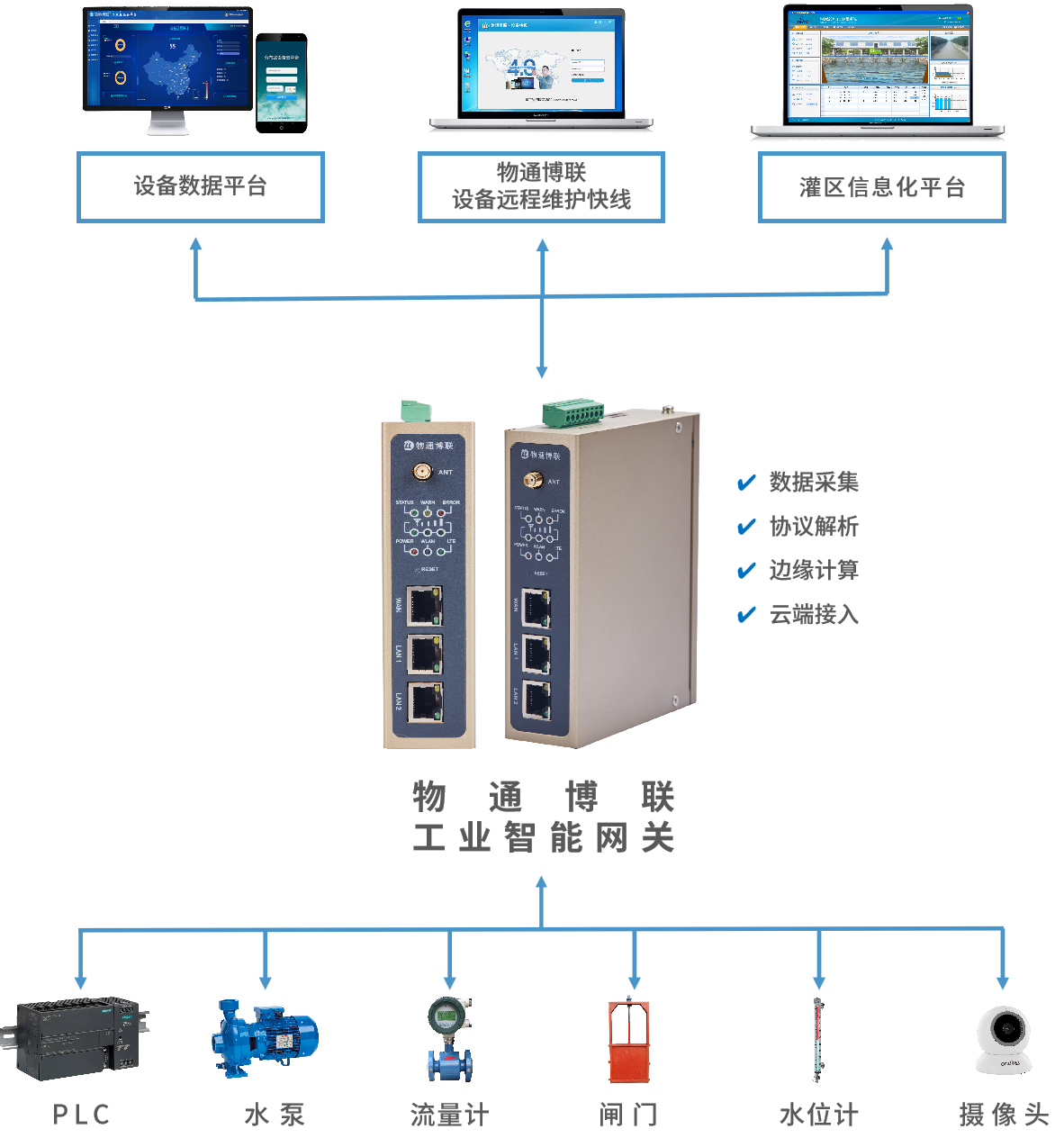03 解决方案 数字灌区内的闸门、水泵及灌溉等设备通常都会配备PLC实现自动化控制,根据设定程序进行自动定时开关灌溉动作,因此这些设备的运行安全稳定是事关灌区水资源配置的重要事项。 对此,yth游艇会yth206给予接入多个闸门、水泵、灌溉设备PLC及传感器的工业智能网关,实时采集设备数据并传输到智慧灌区信息化平台,实现多个设备运行状态与工艺参数的地图式监控、在线管理与故障报警,并给予远程控制及与远程维护等便捷操作方式,以便于及时采取措施,助力提升灌区信息化管理水平,提高水资源利用效率,减少水资源浪费。