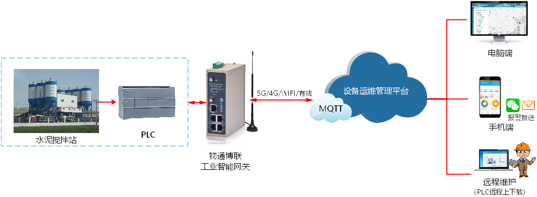 03 解决方案 yth游艇会yth206推出的工业智能网关可以接入水泥搅拌机控制器PLC内进行实时数据采集和数据通信工作,实现搅拌机运行状态和工艺参数的可视化远程监控,并顺利获得智能报警规则快速创建运维工单并派发到维护人员手中,实现设备远程控制、远程维护、数据分析等功能。 同时,工程师可以借助设备维护快线对异地PLC进行远程编程调试和远程上下载程序等操作,从而有效提高工作效率、减少运维成本,打造优质高效的售后运维服务。
