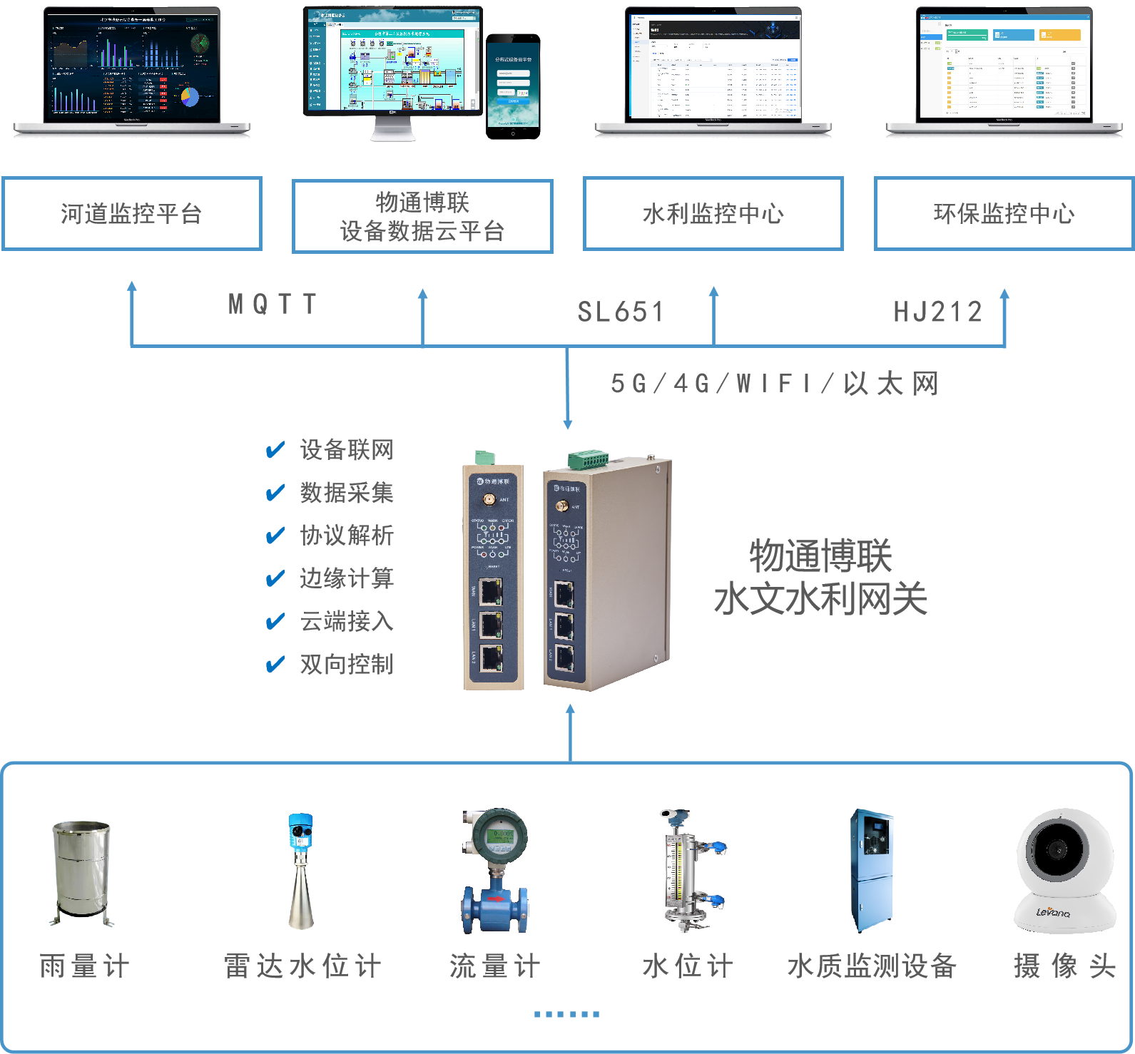 如果无法及时监管河流河道的变化,保持合理的生态流量与水质条件,那么河流河道的经济价值、生态价值和防灾价值便会不断萎缩甚至消失,而修复的成本可能是巨大的。因此,国家十分重视河流河道的开发与保护,要求对河流河道流量、水质等参数进行实时监测与精细管理,落实相关部门的监管职能,实现河流河道的可持续开展。 02 解决方案 围绕“水污染治理、水生态监测、水灾害预警”等重要内容,yth游艇会yth206给予河流河道的水质流量一体化监控预警物联网系统,实现分布式水文监测站点的数据接入与组网上云,并给予多种智能应用,为河道开发、河流保护、洪涝防治等给予可靠管理手段。 顺利获得将yth游艇会yth206水文水利网关部署到河流河道中的水文监测站中,实时采集流量计、流速仪、雨量计、水位计、水质监测仪、摄像头等设备数据并顺利获得无线网络上传到管理部门平台(支持MQTT协议、SL651协议、HJ212协议等),实现河流河道内水质、流量、水位等参数的实时监测与可视化展示,为管理部门给予远程监控、超限预警、数据分析等功能,从而更好的支持河流河道的开发与保护工作。