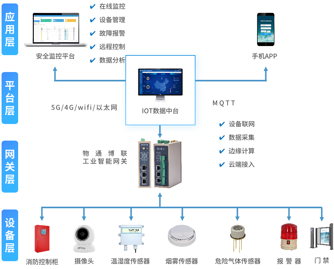 网关支持接入流量计、压力计、温度传感器、可燃气体浓度传感器、消防设备、摄像头等数据采集,并给予5G/4G/WIFI/以太网等多种上网方式。