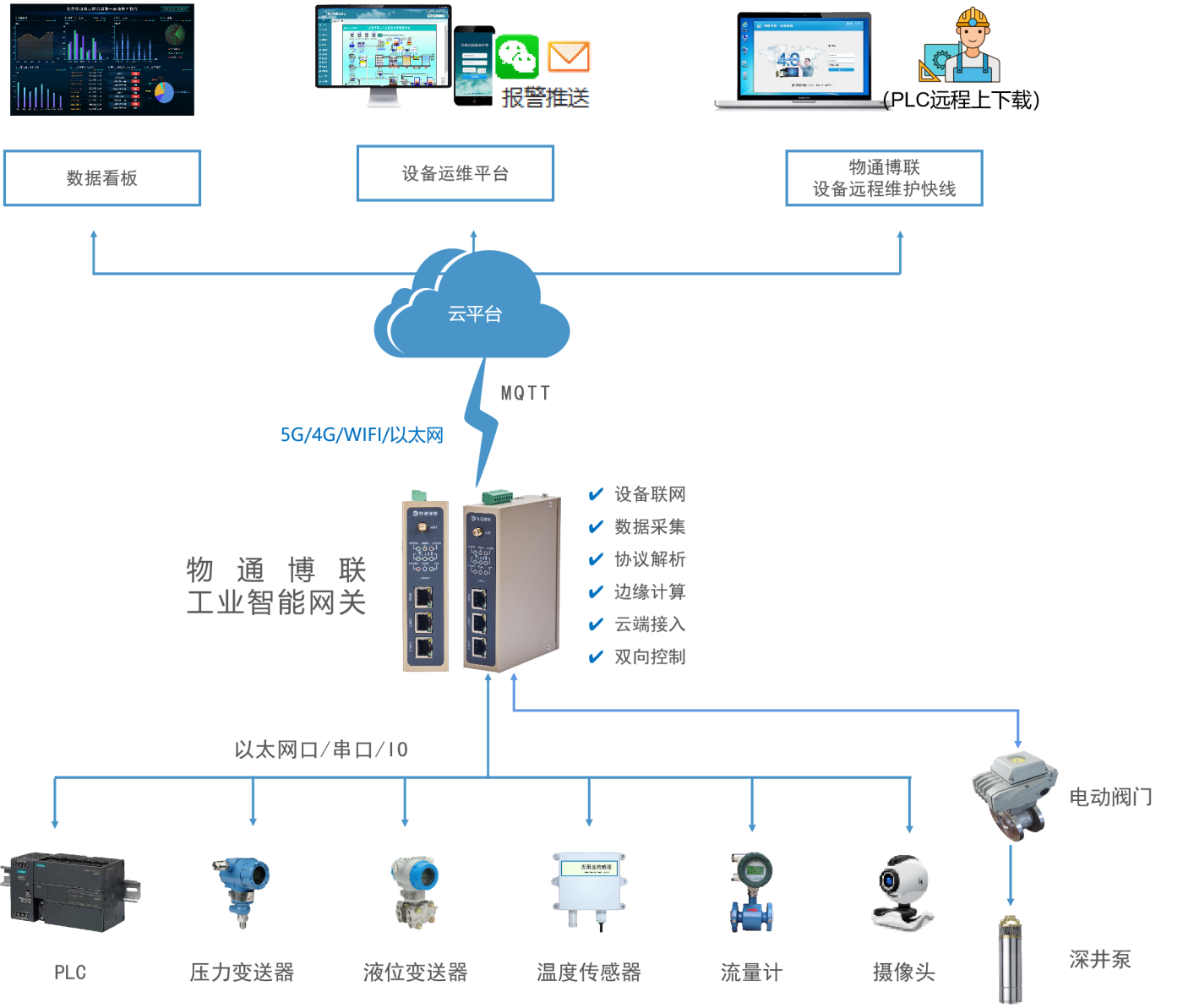 顺利获得yth游艇会yth206工业智能网关采集解析现场泵站中的PLC、压力变送器、温度传感器、液位变送器、流量计等设备运行状态和运行数据,再顺利获得4G网络将数据上传到云平台进行远程监控,平台可视化展示泵站数据和运行情况,管理运维人员可以顺利获得PC端平台和手机端小程序随时随地监控现场泵站情况,实现远程管理、故障报警、远程维护、数据分析等功能,同时云平台支持下控网关,可以对电动阀门写入开关值,实现远程启停泵站设备,做到实时在线、无人值守,降低运维人力成本。